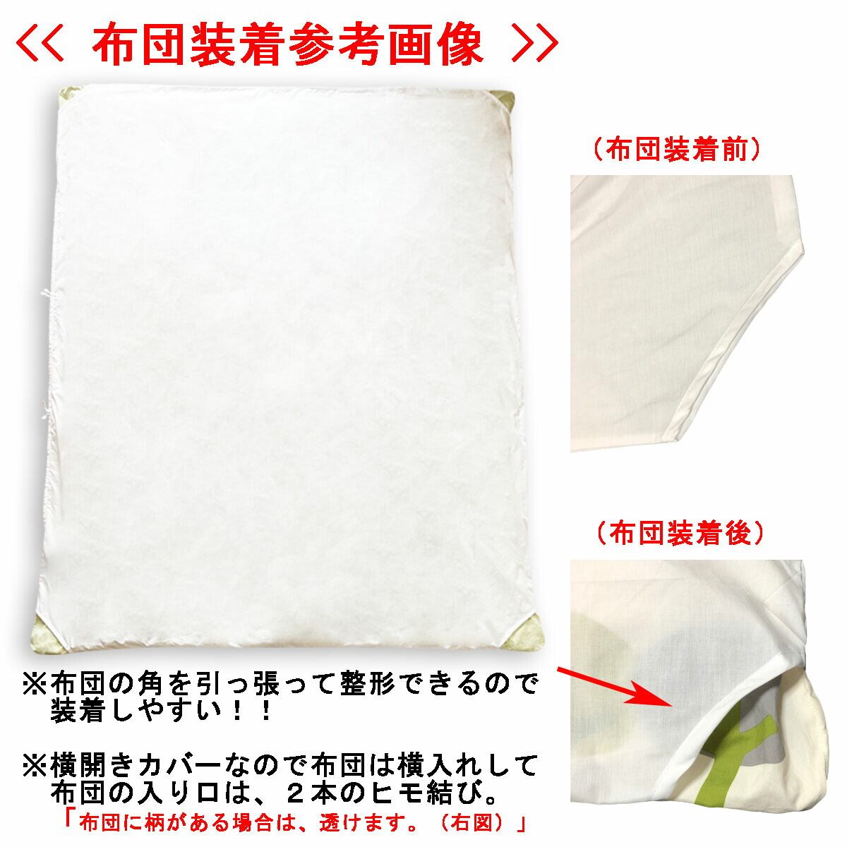 布団は、横から入れて、布団の入り口を2箇所ヒモ結び。