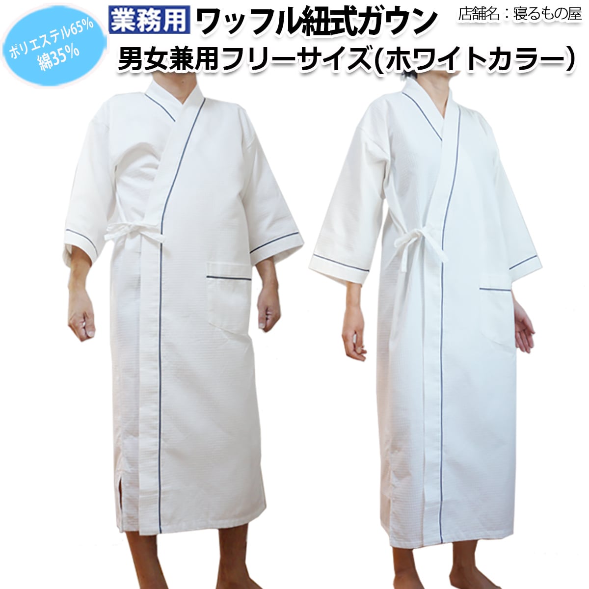 ガウン業務用【単品】ポリ65% 綿35% 大人用フリーサイズ ワッフル紐式 ポケット付き ホワイト 白 メール便(ポスト投函配送) 三露産業 パジャマ 病衣 部屋着 ホテル 旅館 民宿 民泊/367710010