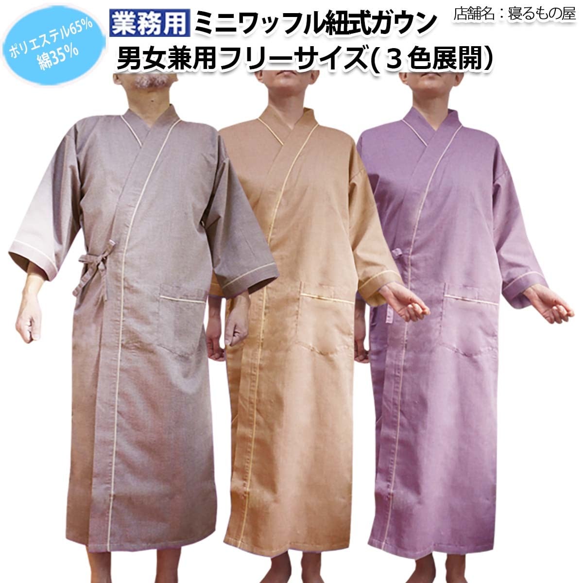 ガウン業務用【単品】ポリ65% 綿35% 大人用フリーサイズ ミニワッフル紐式 ポケット付き グレー ブラウン パープル メール便(ポスト投函配送) 三露産業 パジャマ 病衣 部屋着 ホテル 旅館 民宿 民泊/367710030